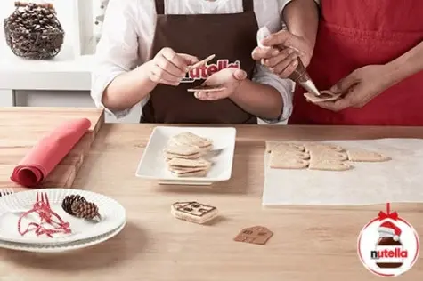 - Mets le Nutella® dans une poche à douille munie d’une petite douille (≈ 2 mm), dépose environ 5 g de Nutella® sur la moitié des biscuits, puis assemble avec les autres biscuits pour former les sablés fourrés. La poche à douille peut également servir à décorer les sablés en forme de maison avec des fenêtres, un toit et une porte.